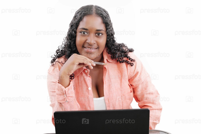 Портрет красивой молодой темнокожей женщины, работающей на ноутбуке