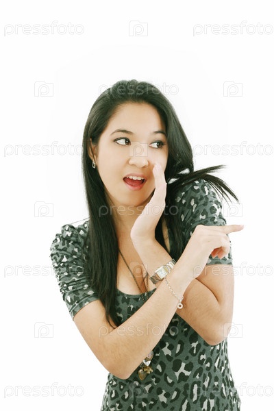 Красивая женщина смеется и указывает на кого-то