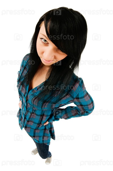 Симпатичная девочка-подросток, объектив "рыбий глаз", на белом фоне