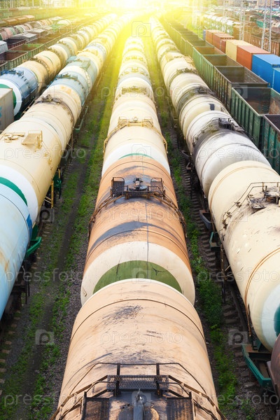 Нефтяные резервуары, контейнеры и вагоны на железнодорожной станции