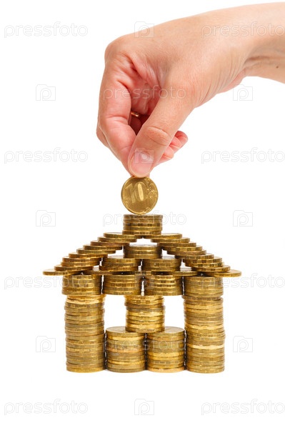Женская рука складывает дом из монет. Изоляция на белом фоне
