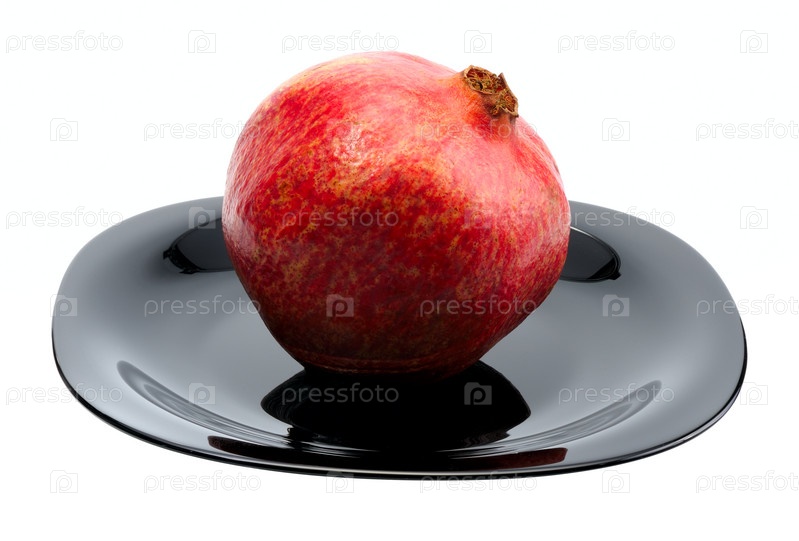 Красный гранат на тарелке на белом фоне