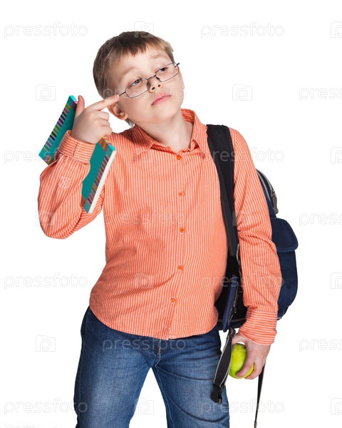 Школьник в очках с яблоком на белом фоне