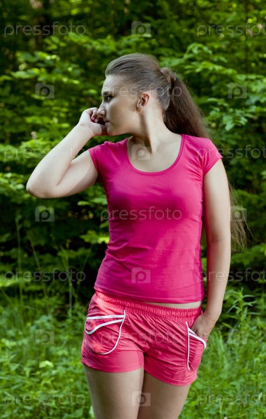Красивая девушка с телефоном в лесу