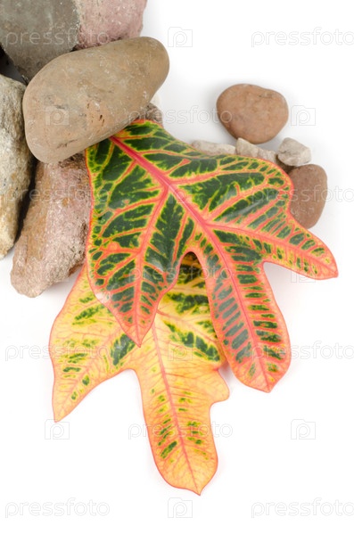 Камни с цветными листьями на белом фоне