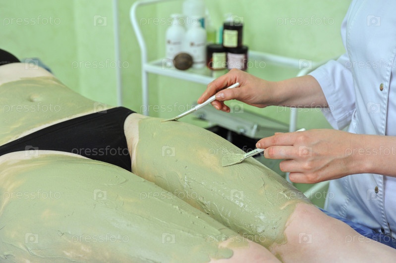 Косметолог делает женщине глиняную маску для тела