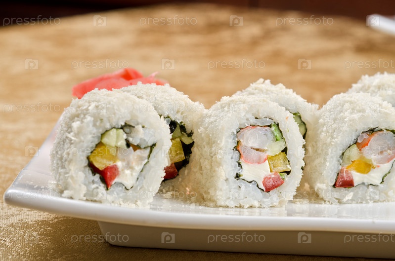 Роллы с креветками, огурцом, перцем и соусом крупным планом