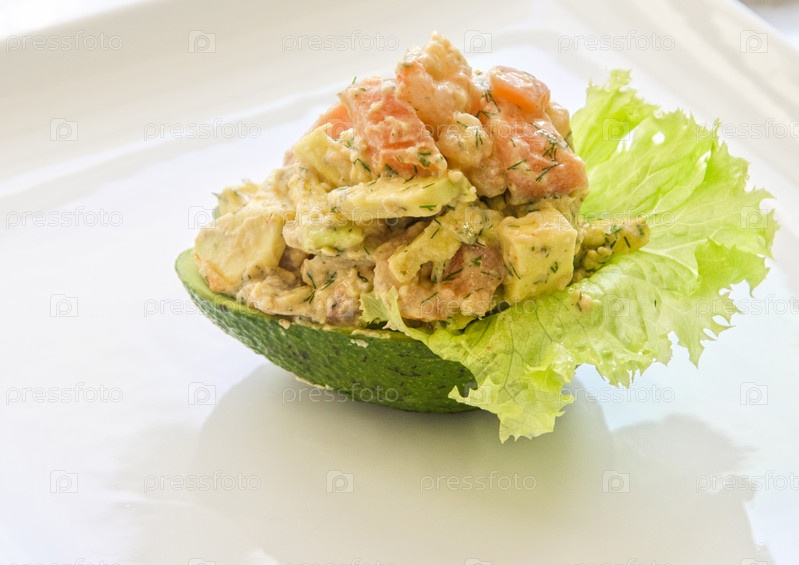 Свежий салат с креветками, лососе6м и авокадо