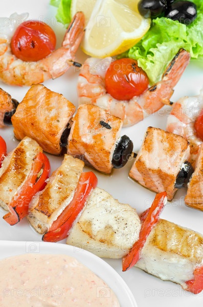 Жареный лосось и креветки с помидорами и перцем на бамбуковых шпажках