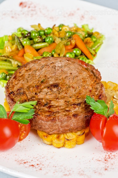 Бифштекс с овощами и соусом
