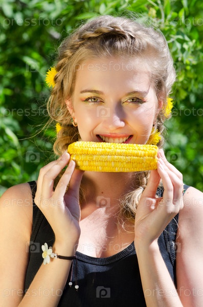 Портрет молодой женщины с кукурузным початком крупным планом
