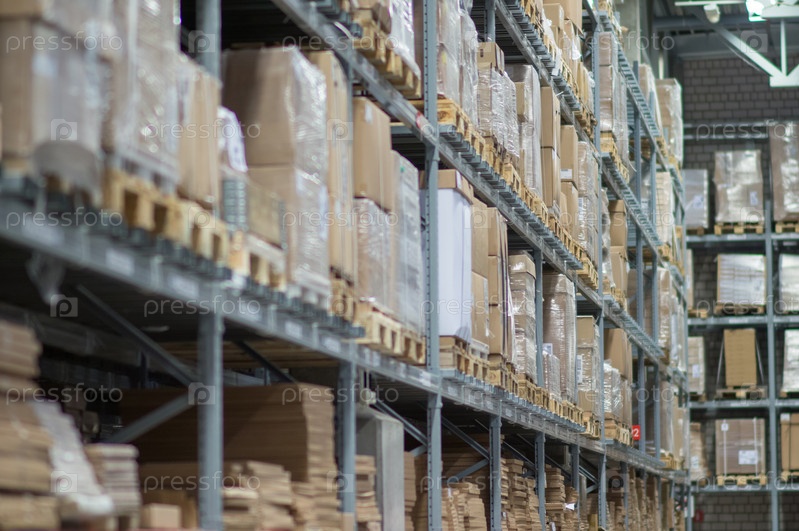 Ряды полок с коробками в современном складе