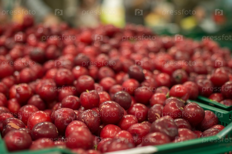 Куча красной сливы в ящике в супермаркете