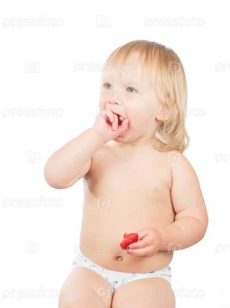 Очаровательная девочка ест клубнику, сидя на белом фоне