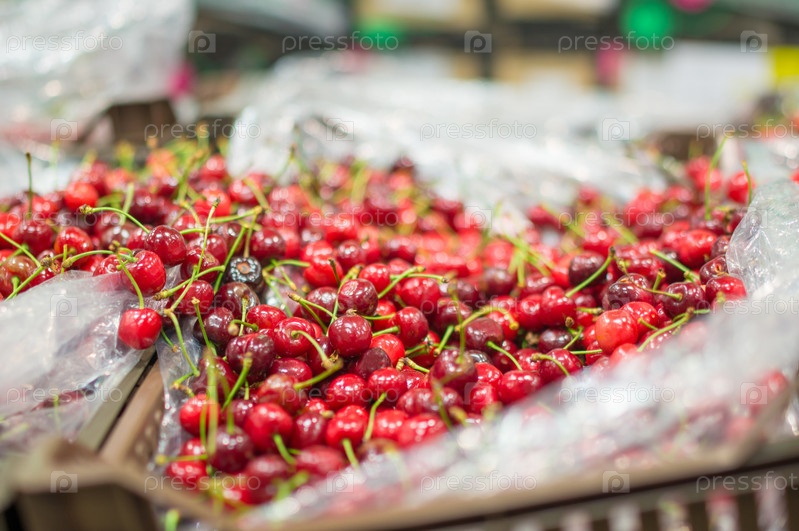 Свежая сочная красная вишня в ящике в супермаркете