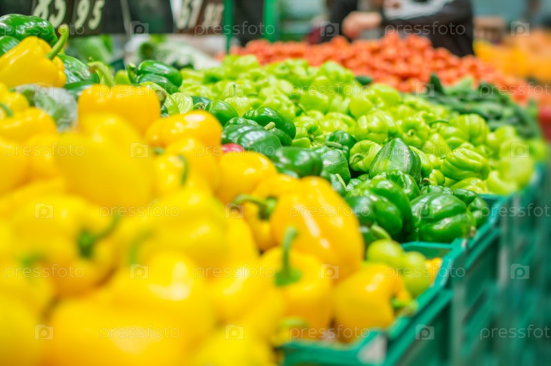 Разнообразный перец в ящиках в супермаркете