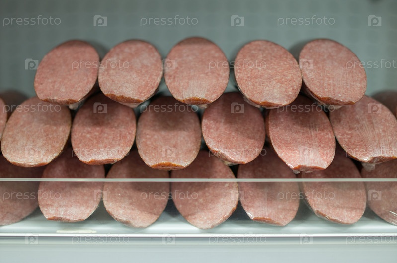 Куча колбасных деликатесов на полке в супермаркете