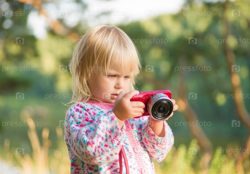 Очаровательный ребенок снимает компактным фотоаппаратом в парке на закате