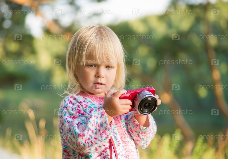 Очаровательный ребенок снимает компактным фотоаппаратом в парке на закате