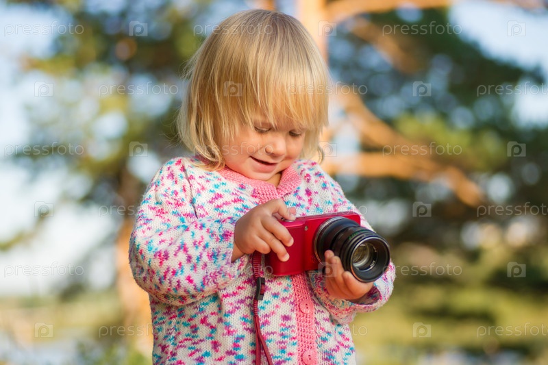 Очаровательный ребенок снимает компактным фотоаппаратом в парке на закате