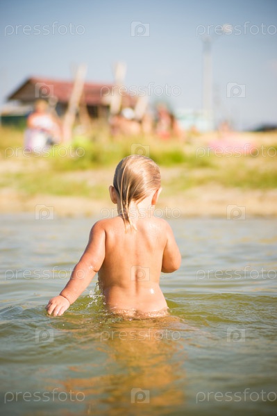 Очаровательный младенец заходит в воду на пляже озера