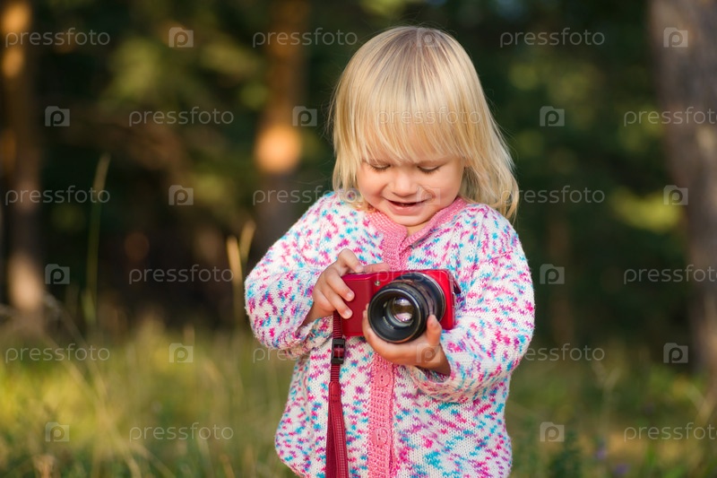 Очаровательный ребенок снимает компактным фотоаппаратом в парке на закате