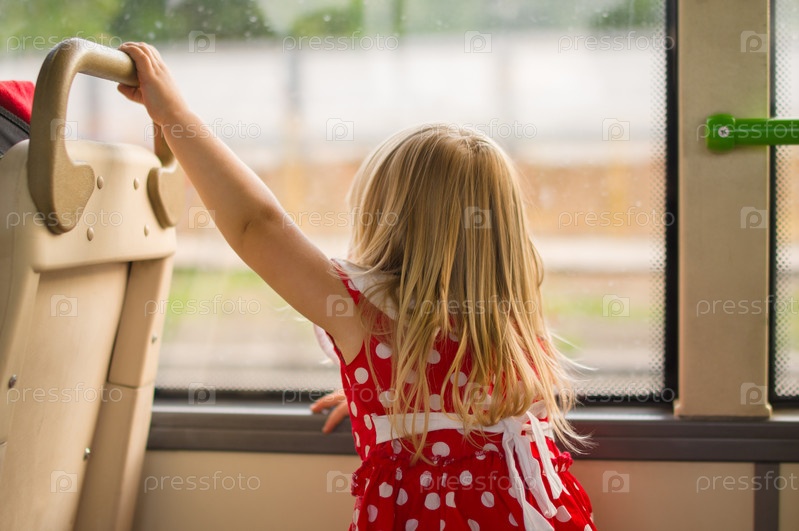 Очаровательная девочка в красивом платье едет в городском автобусе