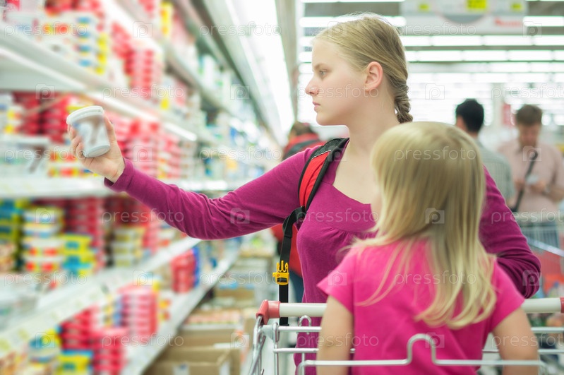 Мать и дочь в молочном отделе в супермаркете