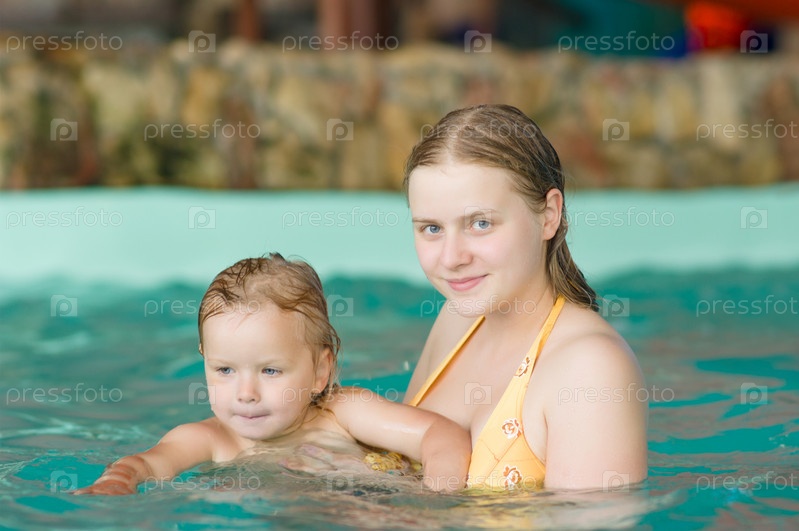 Молодая мать с дочерью плавают в бассейне аквапарка