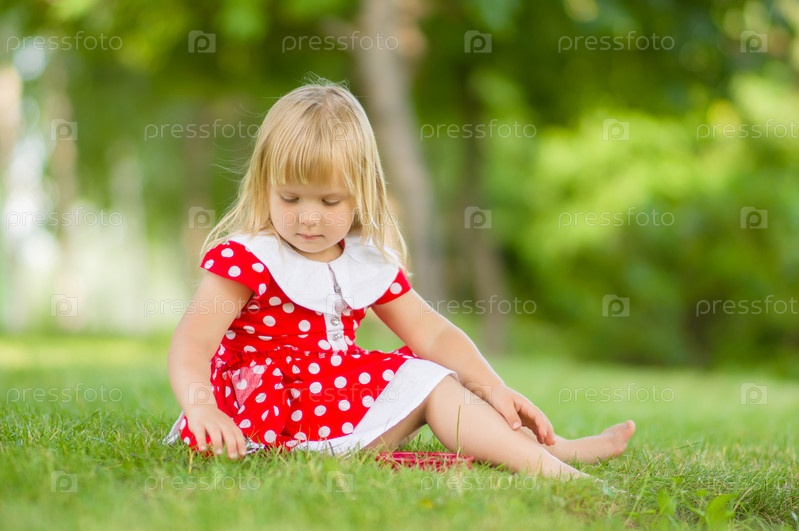 Очаровательная девочка в красивом платье сидит на траве в парке
