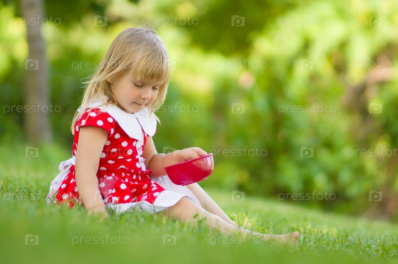 Очаровательная девочка в красивом платье играет с травой в тарелке, делая суп и салат