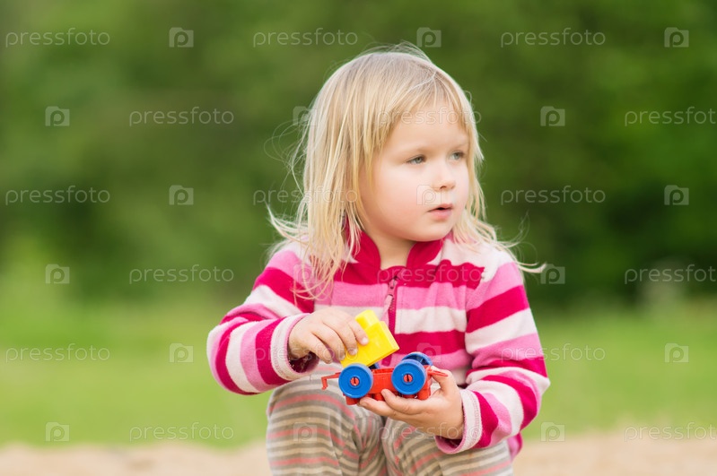 Очаровательная девочка в платье играет с песком в песочнице