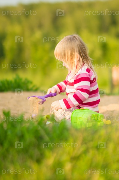 Очаровательная девочка в платье играет с песком в песочнице