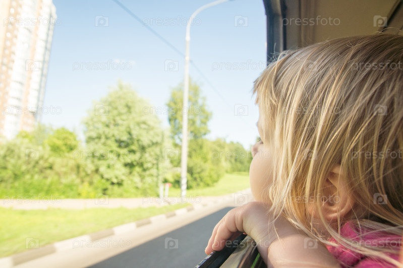 Очаровательная девочка в красивом платье едет в городском автобусе