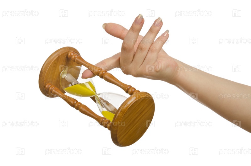 Рука с песочными часами на белом фоне