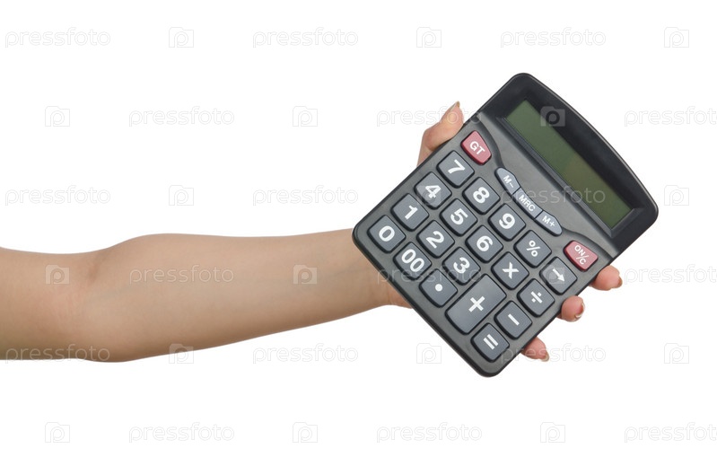 Калькулятор в руке на белом фоне