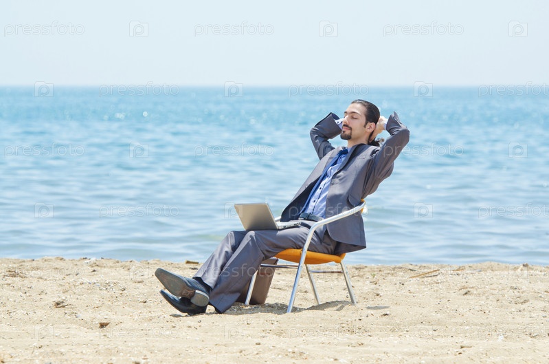 Бизнесмен работает на ноутбуке на берегу моря