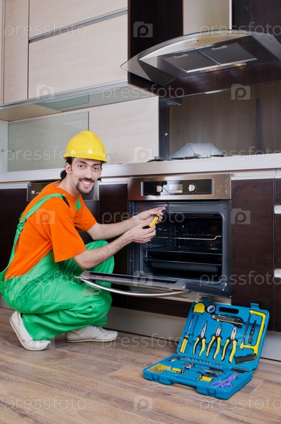 Строитель занимается сборкой мебели на кухне