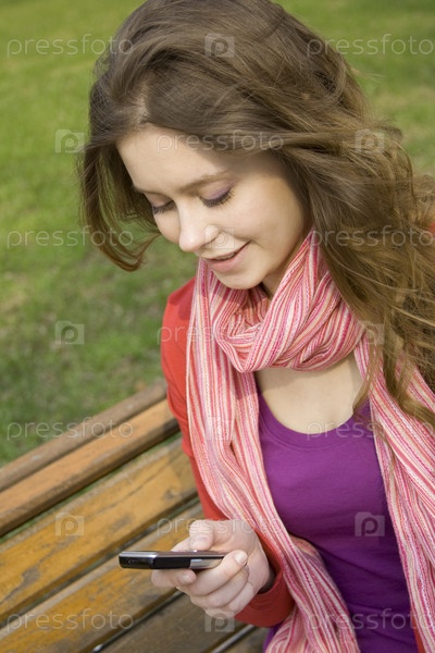 Красивая девушка отправляет СМС-сообщения по мобильному телефону