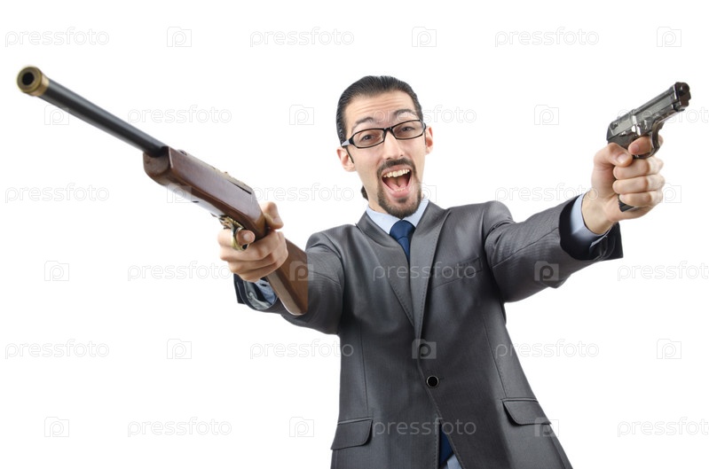 Бизнесмен с оружием, изолированный на белом фоне