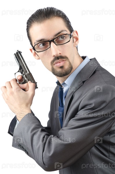 Бизнесмен с пистолетом, изолированный на белом фоне