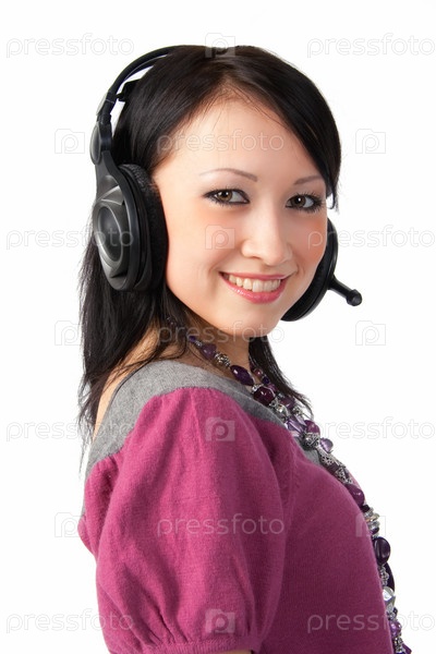 Привлекательная улыбающаяся женщина в наушниках на белом фоне