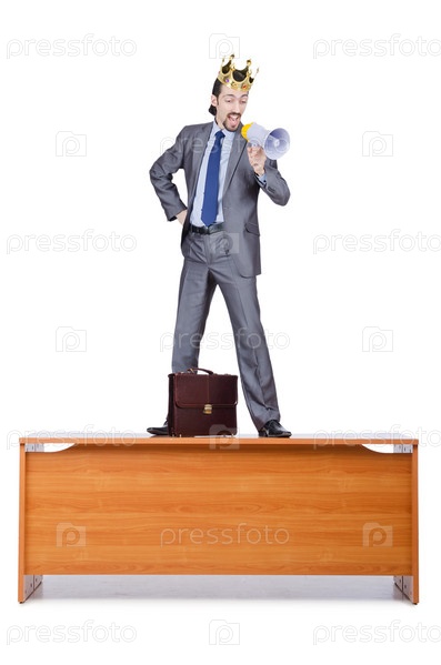 Человек на столе кричит в громкоговоритель