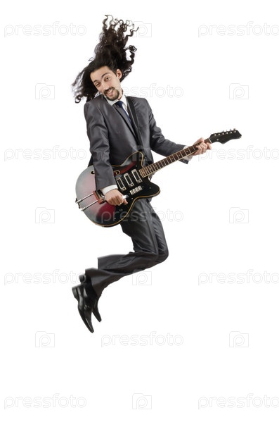 Гитарист в деловом костюме на белом фоне