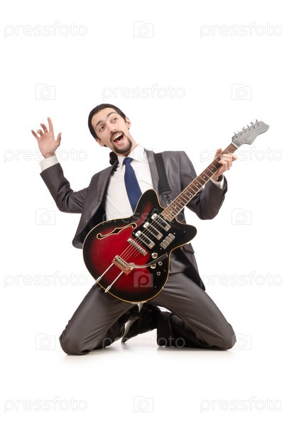 Гитарист в деловом костюме на белом фоне