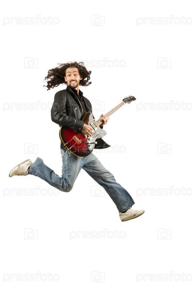 Молодой человек играет на гитаре на белом фоне
