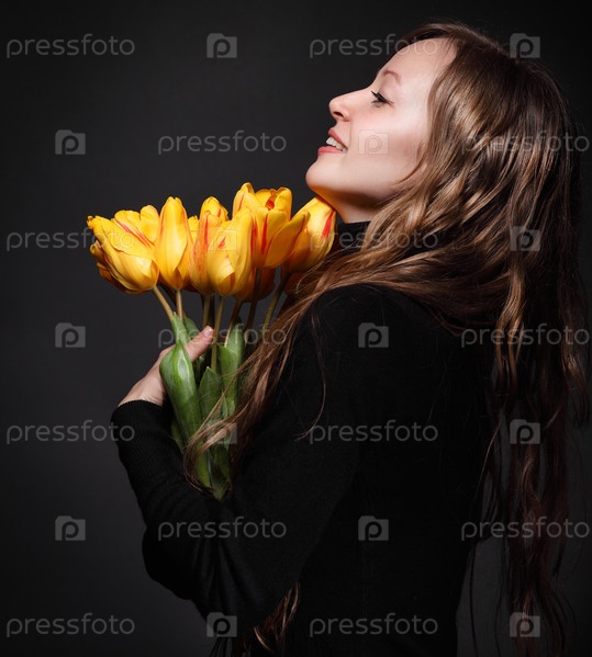 Счастливая блондинка с букетом из оранжевых тюльпанов