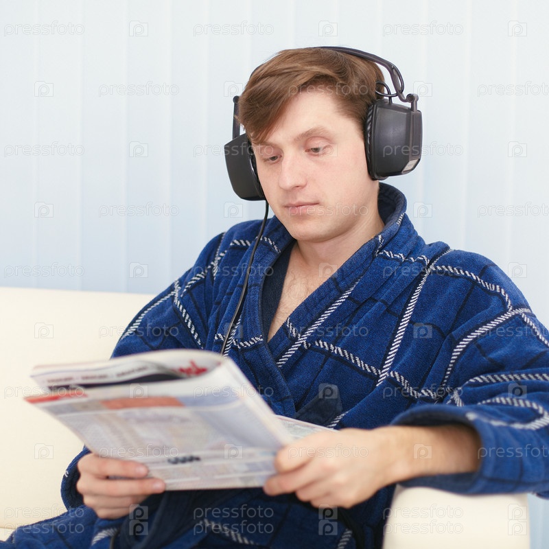 Мужчина в больших наушниках сидит на диване и читает журнал