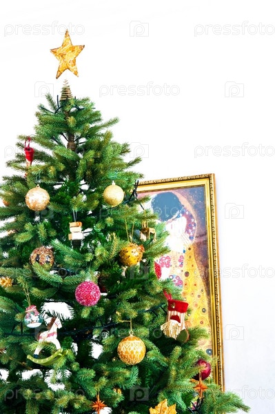 Рождественская ель с шарами, звездой и подарками