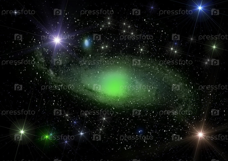 Зеленая спиральная галактика и звездная пыль с сияющими звездами